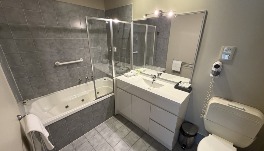 This room has a Queen-size bed fitted with quality linen and a large bathroom with toilet, spa jet bath & shower. The suite features both heating & air conditioning. It also features a bar fridge & small seating area accompanied by a flat screen tv with 5 Foxtel channels provided. The room also comes with free-wifi & iron board facilities.