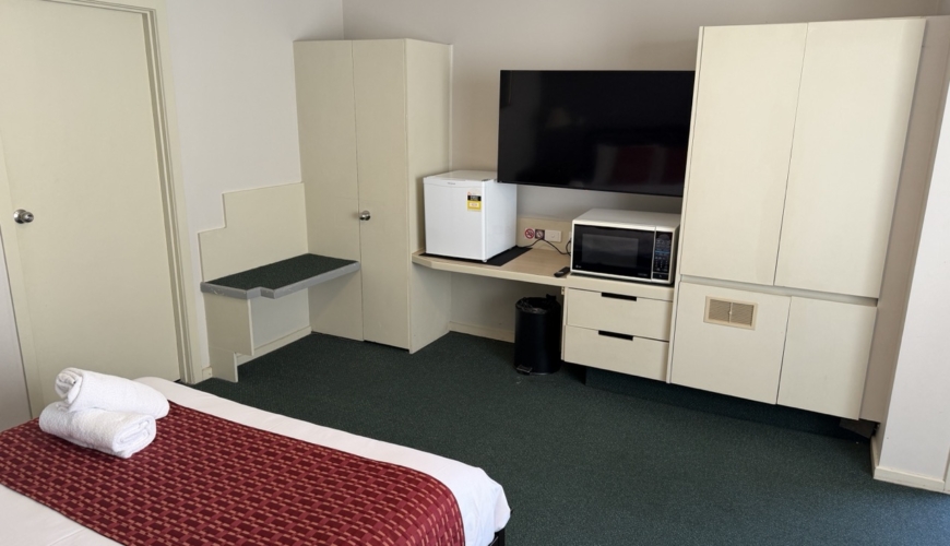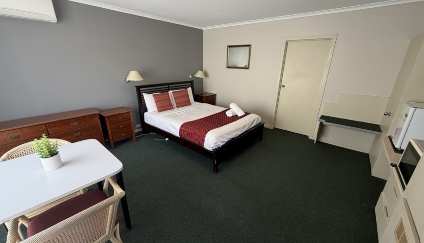 This room has a Queen-size bed fitted with quality linen and a large bathroom with toilet, deep oval spa & walk-in shower. The suite features a both heating & air conditioning. It also features timber furniture with bar fridge & small seating area accompanied by a flat screen tv with 5 Foxtel channels provided. The room also comes with free-wifi & iron board facilities.