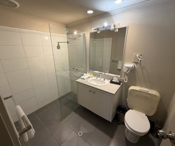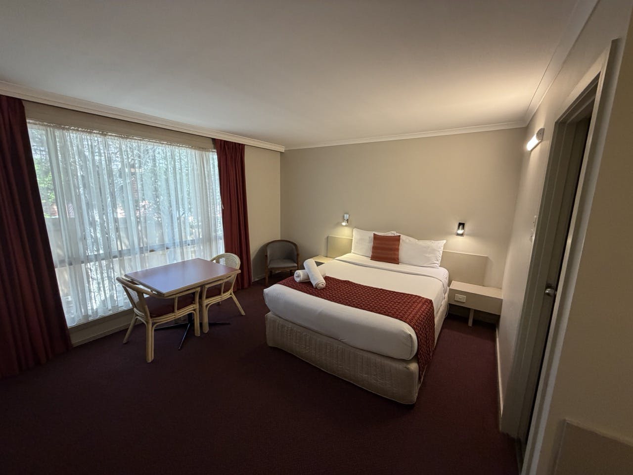This room has a Queen-size bed fitted with quality linen and a large bathroom with toilet & shower. The suite features both heating & air conditioning. It also features a bar fridge & small seating area accompanied by a flat screen tv . The room also comes with free-wifi & iron board facilities.
